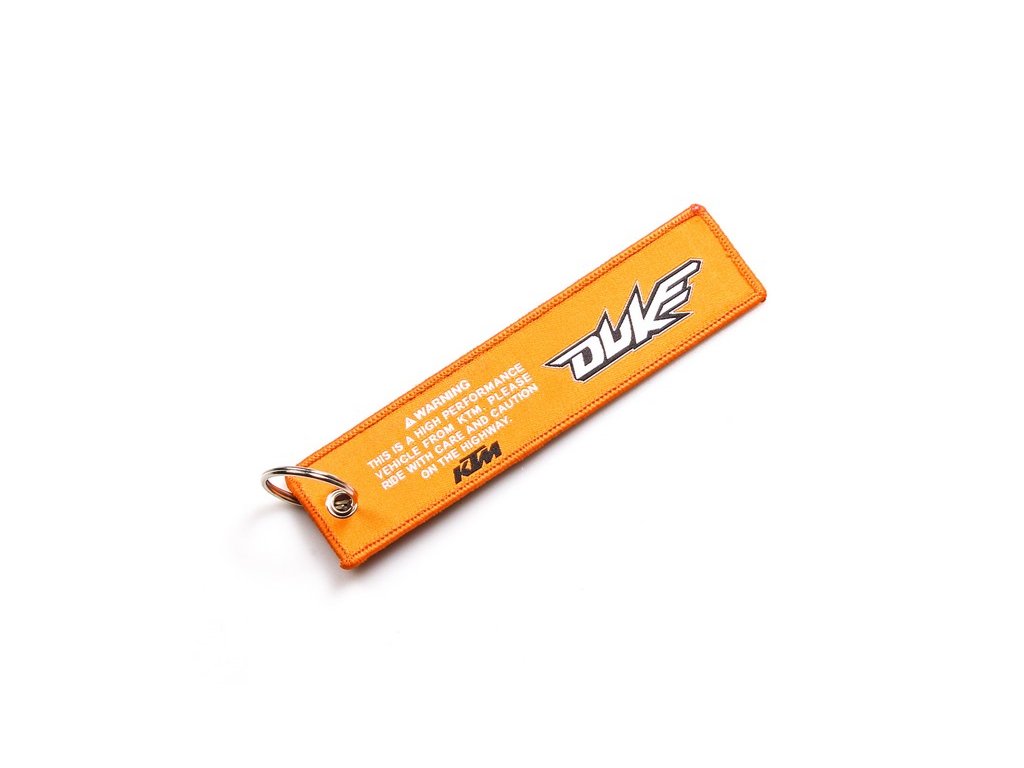 Textilní klíčenka KTM Duke se stylovým vyobrazením na typicky oranžovém podkladu. Přívěsek je možné pomocí kroužku snadno připnout na klíče. Jedna strana klíčenky má na sobě nápis DUKE psaný ve stylu graffiti, ve spodní části je logo KTM RACING. Na druhé straně je text: Warning. This is a high performance vehicle from KTM. Please ride with care and caution on the highway. KTM. Tento text je možné volně přeložit jako: Varování. Jedná se o vysoce výkonné vozidlo od KTM. Jezděte opatrně a pozorně.