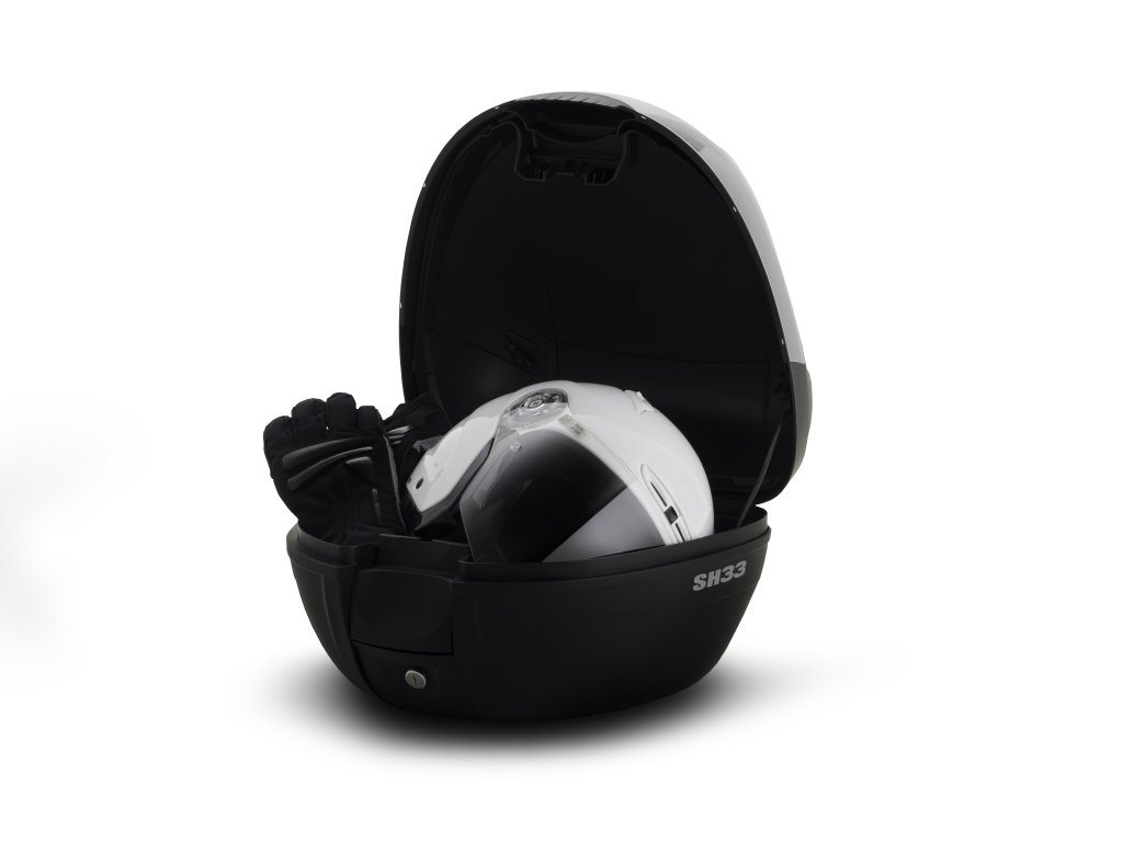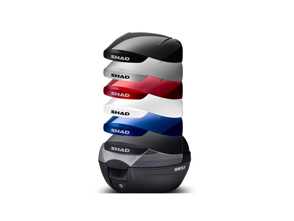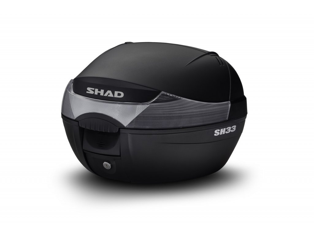 Vrchní kufr SH33 s kapacitou pro jednu helmu a rukavice Vrchní kufr SH33 je kompaktní a velmi praktický vrchní kufr vyrobený z vysoce kvalitního tvrzeného polypropylenu, schopný pojmout vyklápěcí helmu a rukavice. Jedná se o základní model řady vrchních kufrů SHAD se zaobleným tvarem a kouřovou odrazkou. Svou velikostí je vhodný pro skútry a menší motorky s nižším objemem. Kufr je vybaven zámkem a stejně jako všechny vrchní kufry SHAD, je možné ho otevřít a zavřít pouze jednou rukou, k otevření nebo zavření není potřeba klíč. Klíč je nutný pouze v případě, že chceme kufr zamknout. Kufr má úchytku, která přebírá roli ergonomické rukojeti pro snadné přenášení kufru. Pokud kladete důraz na design, určitě oceníte možnost výběru z různých barevných variant krytu kufru a nebo lze zvolit variantu bez laku, kdy si barvu můžete sami přizpůsobit podle vlastního vkusu. Jako volitelné příslušenství lze ke kufru dokoupit opěrku a brzdové světlo. Opěrka (D0RI40) zaručuje větší pohodlí pro spolujezdce. Brzdové světlo (D0B29KL) je úsporné LED světlo, jehož montáž je velice snadná. Toto světlo zvyšuje bezpečnost provozu, protože motocykl se s tímto světlem stává mnohem viditelnější zezadu. Stejně jako všechny vrchní kufry SHAD (kromě TR48/TR37) je i kufr SH33 dodáván s plotnou a sadou montážních šroubů.Doplňkové parametry
