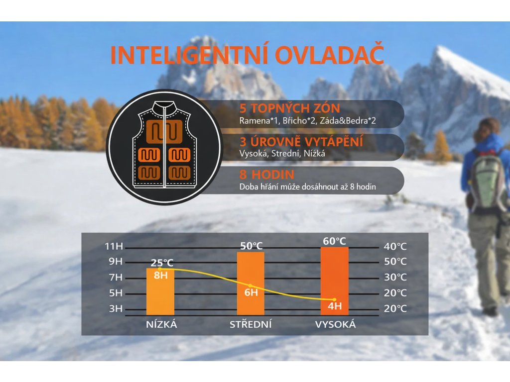 Vyhřívaná vesta je vyrobena z příjemného fleecového materiálu s úpravou proti žmolkování, který zajišťuje komfort při nošení. Díky integrovaným topným zónám v oblasti břicha, zad a beder poskytuje účinné zahřátí přesně tam, kde je potřeba.